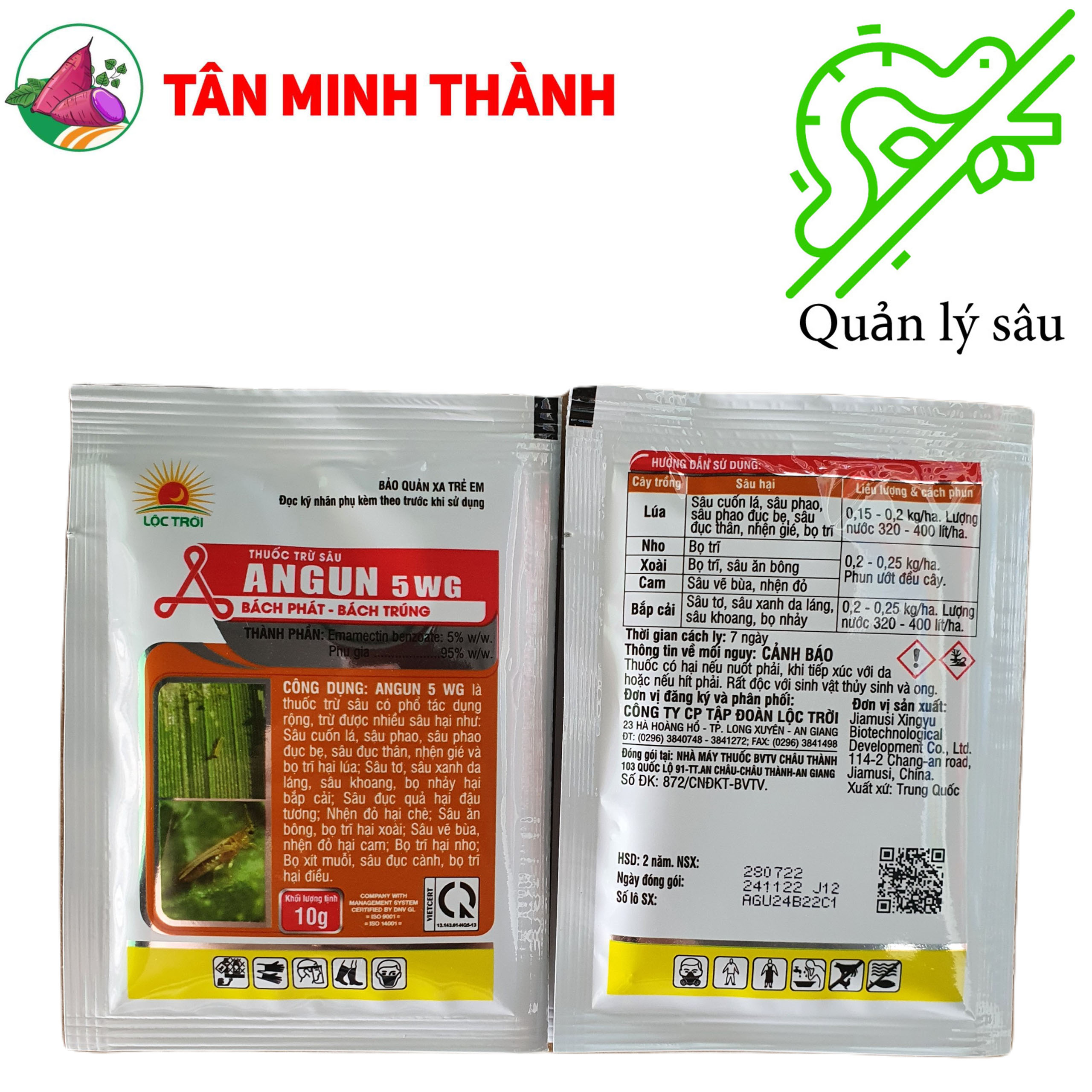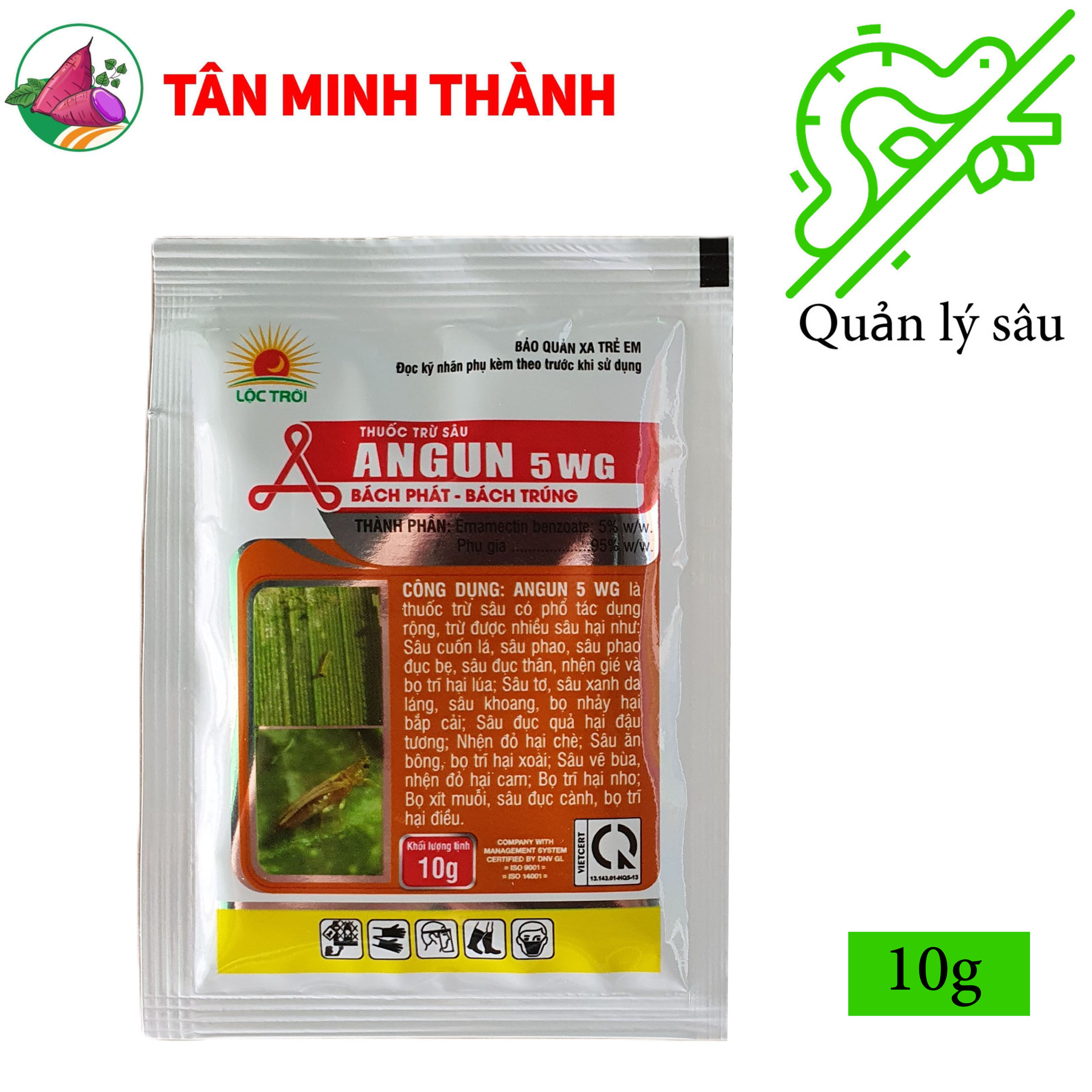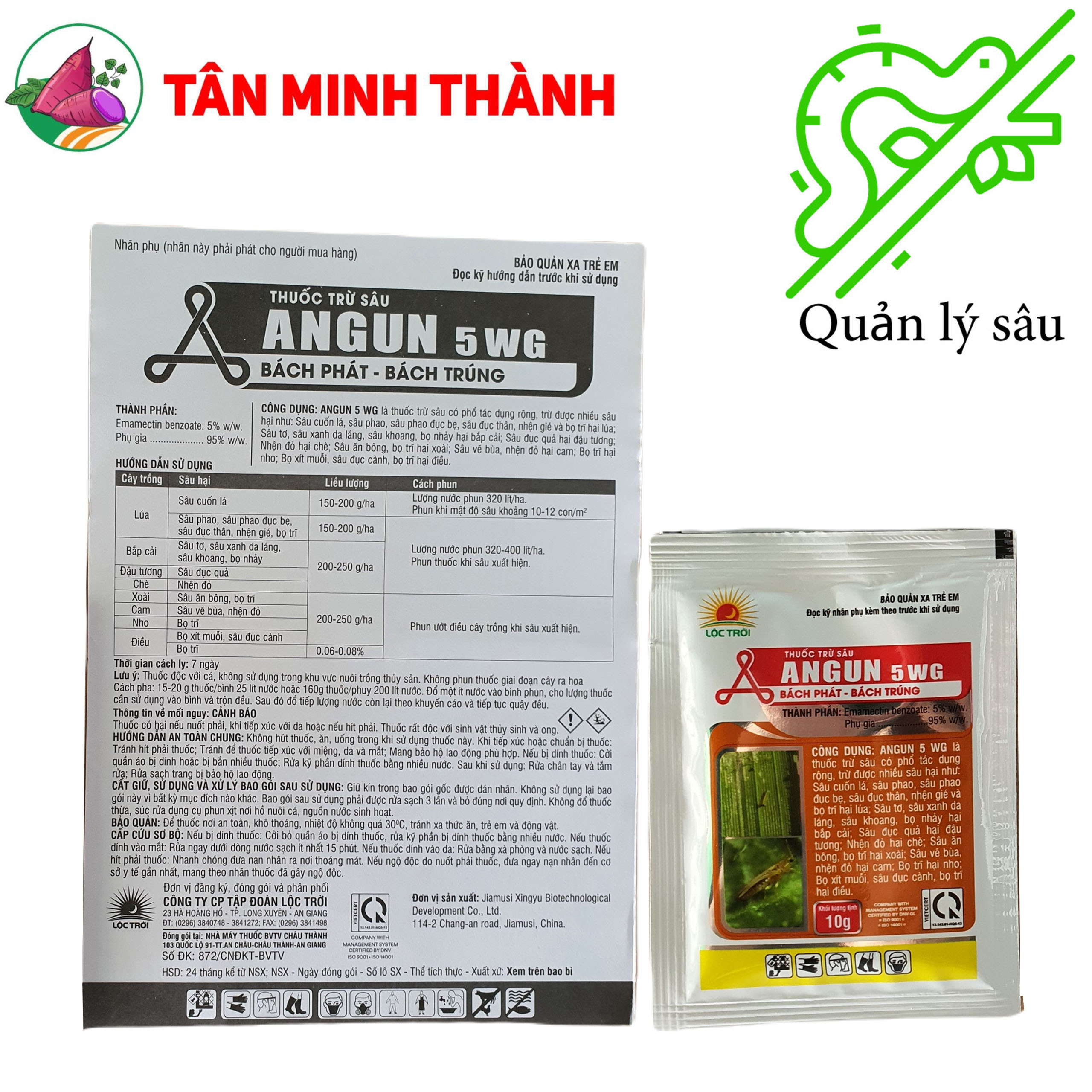 Angun 5WG là thuốc trừ sâu có phổ tác dụng rộng, trừ được nhiều sâu hại như: sâu cuốn lá, sâu đục thân, sâu phao đục bẹ, nhện gié, bọ trĩ hại lúa; sâu tơ, sâu xanh da láng, sâu khoang, bọ nhảy hại bắp cải; sâu đục quả hại đậu tương; nhện đỏ hại chè; sâu ăn bông, bọ trĩ hại xoài, sâu vẽ bùa, nhện đỏ hại cam; bọ trĩ hại nho; bọ xít muỗi, sâu đục cành, bọ trĩ hại điều.