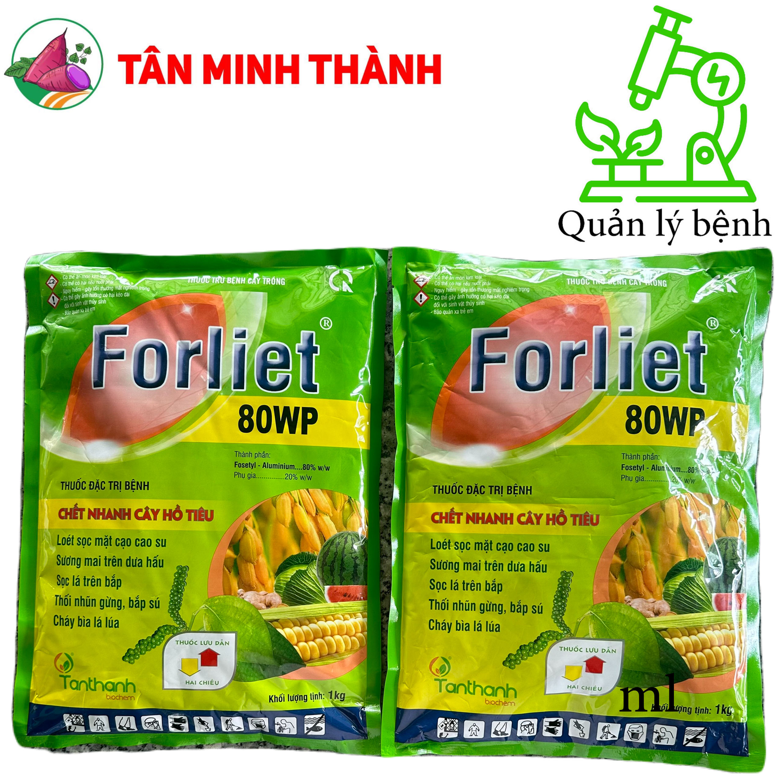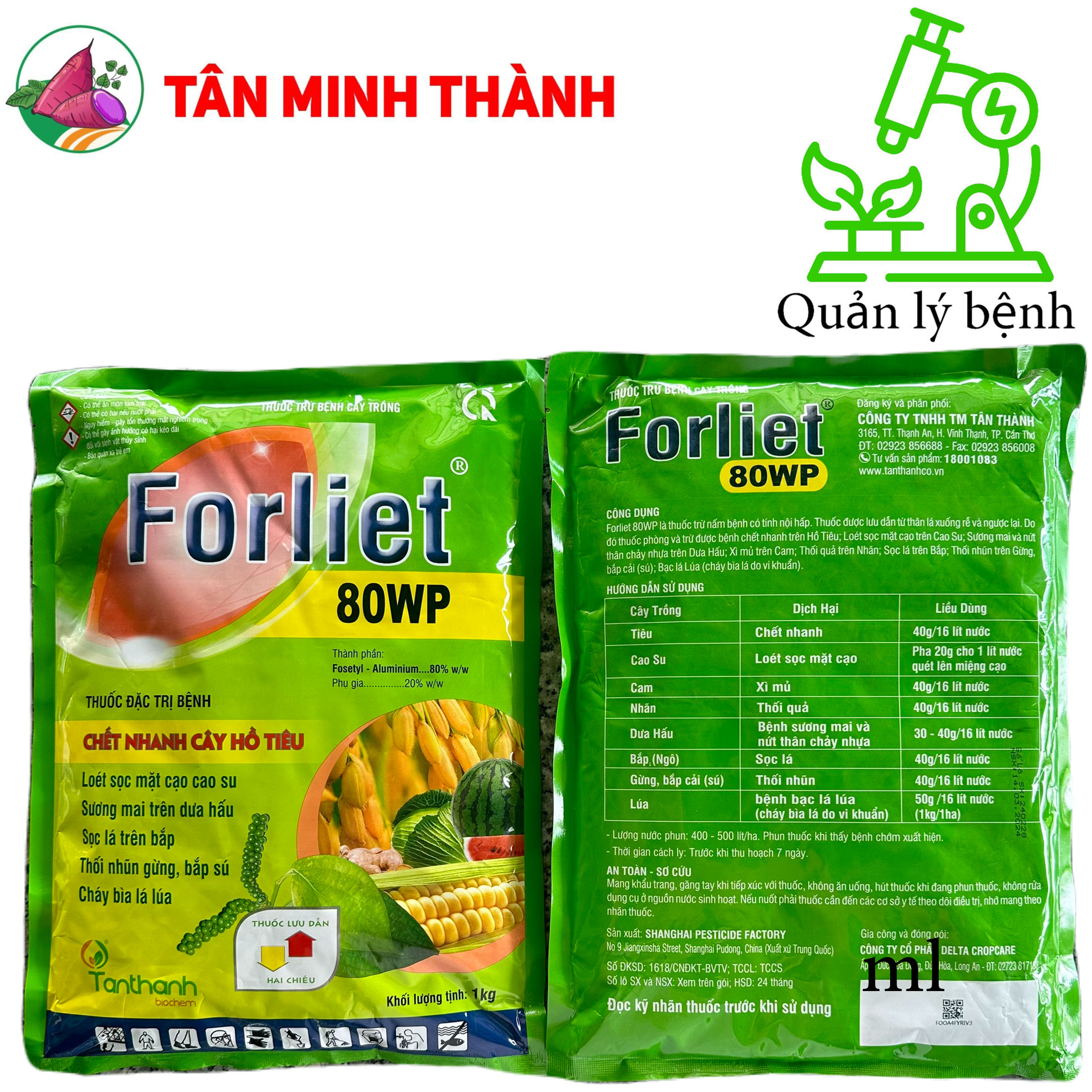 Forliet 80WP là thuốc trừ nấm bệnh có tính nội hấp. Thuốc được lưu dẫn từ thân lá xuống rễ và ngược lại. Do đó thuốc phòng và trừ được bệnh chết nhanh trên hồ tiêu; Loét sọc mặt cạo trên cao su; sương mai và nứt thân chảy nhựa trên dưa hấu; xì mủ trên cam; thối quả trên nhãn; sọc lá trên bắp; thối nhũn trên gừng, báp cải; bạc lá lúa, cháy bìa lá do vi khuẩn.
