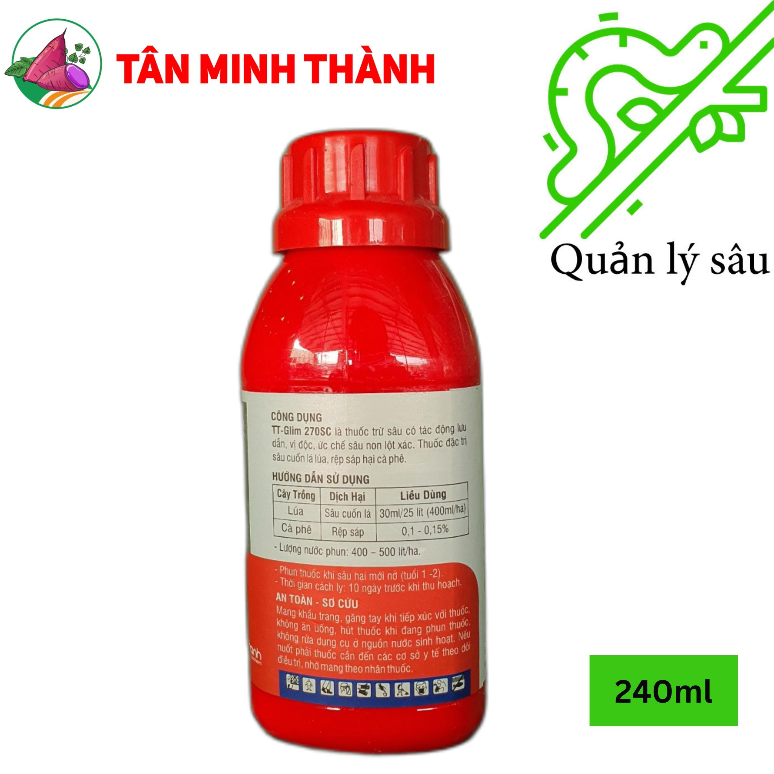 TT Glim 270SC là thuốc đặc trị sâu cuôn lá, trên lúa và rệp sáp, có tác động lưu dẫn, vị độc, ức chế sâu non lột xác. Ức chế sự hình thành kitin tạo lớp da cơ thể sâu, làm cho sâu non không lột xác được mà chết. Làm ngừng sự phát triển của nhộng, nhộng không vũ hoá được ra con trưởng thành. Hạn chế sự hình thành trứng và làm trứng đẻ ra không nở được.