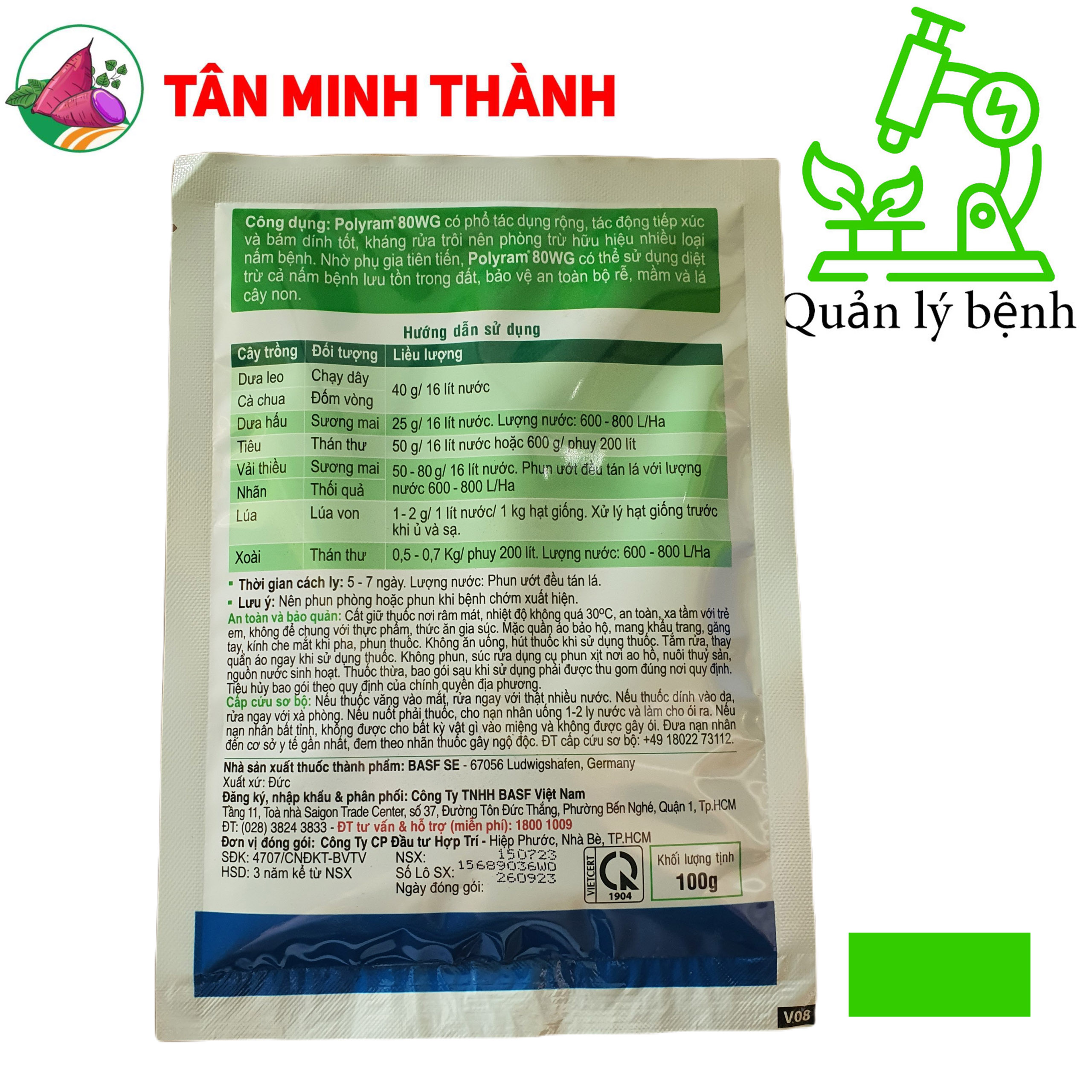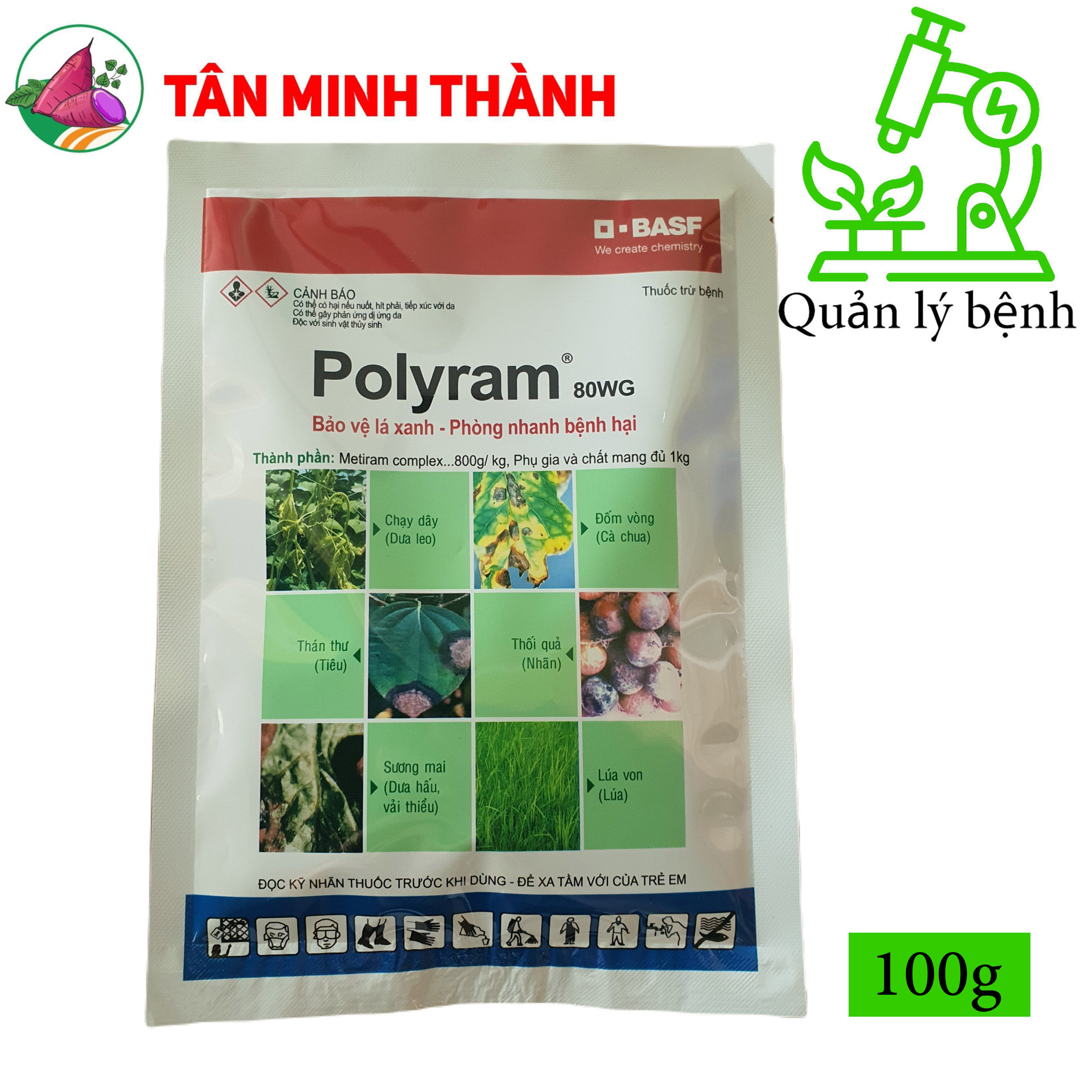 Polyram 80WG là thuốc trừ bệnh có phổ tác dụng rộng, rác động tiếp xúc và bám dính tốt, kháng rửa trôi nên phòng trừ hữu hiệu nhiều loại nấm bệnh. Nhờ phụ gia tiên tiến. Polyram 80WG có thể sử dụng diệt trừ cả nấm bênh lưu tồn trong đất, bảo vệ an toàn bộ rễ, mầm và lá cây non. Thuốc trừ bệnh chạy dây dưa leo, đốm vòng cà chua, thán thư tiêu, sương mai trên vãi thiều, thối trái thối quả nhãn, lúa von, thán thư trên xoài.