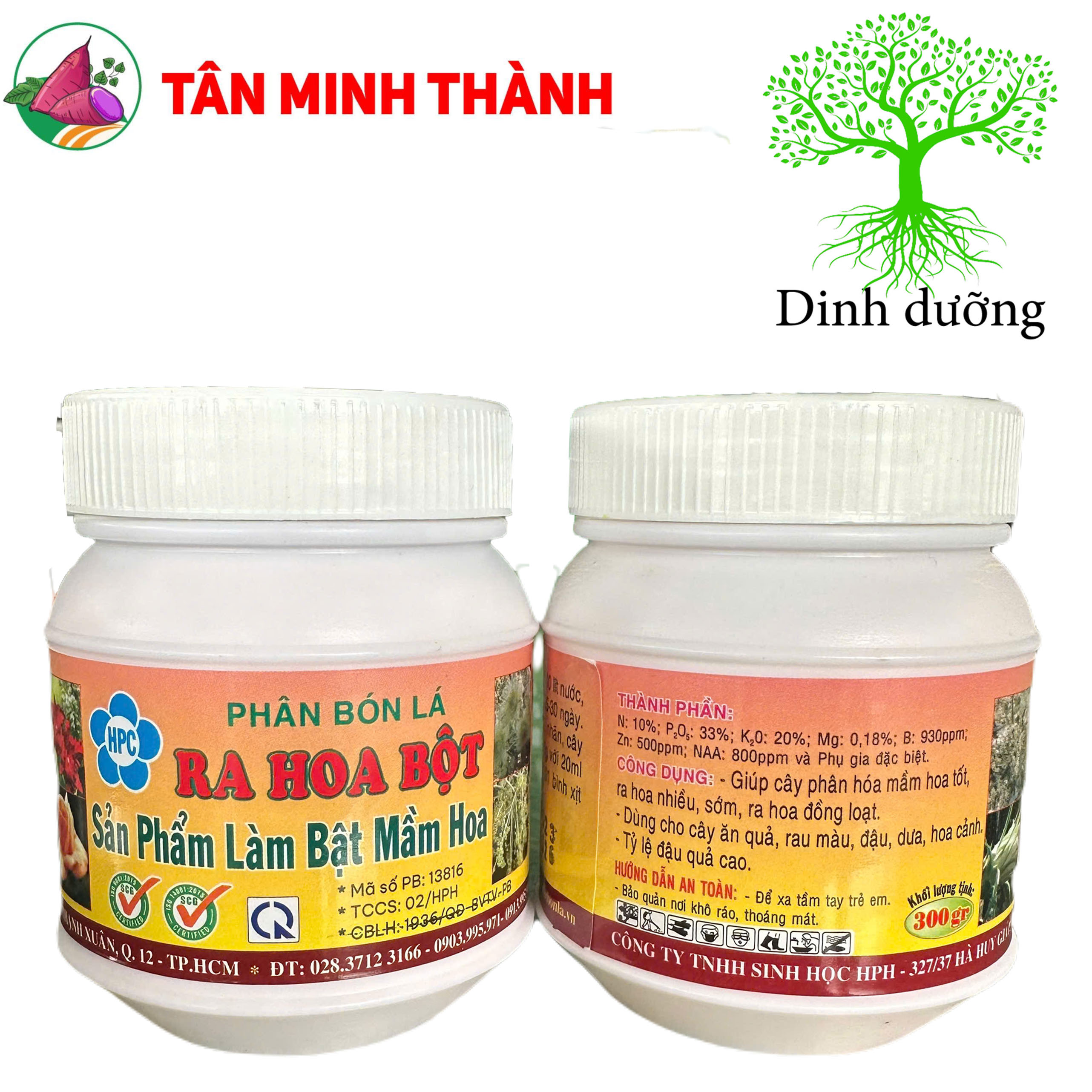 N: 10%; PO: 33%; K,O: 20%; Mg: 0,18%; B: 930ppm; Zn: 500ppm; NAA: 800ppm và Phụ gia đặc biệt