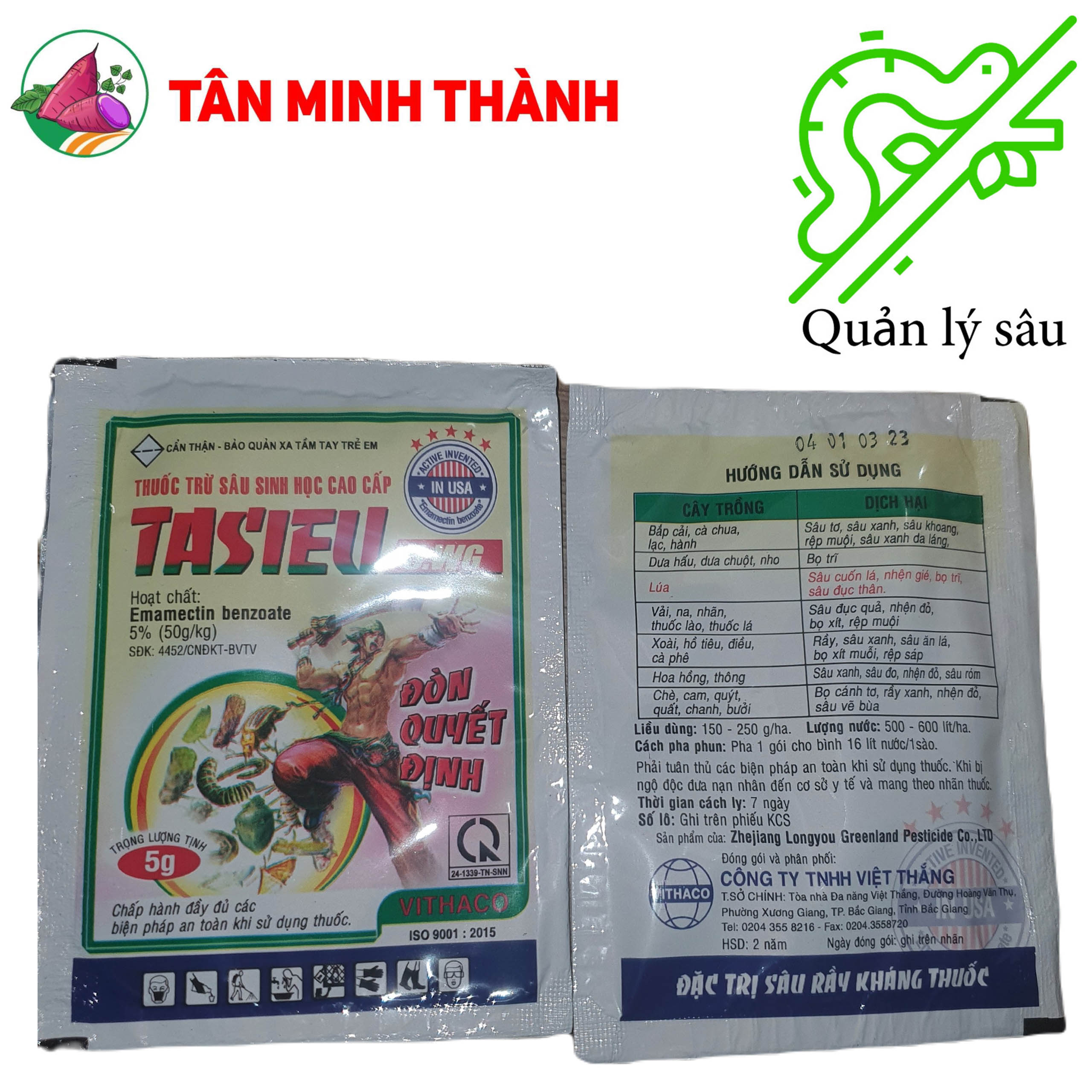 Tasieu 1.9EC là thuốc trừ sâu sinh học chứa hoạt chất Emamectin có tính tiếp xúc, hội hấp, vị độc và lưu dẫn cực mạnh. Có phổ tác dụng rộng. Thuốc đặc trị sâu cuốn lá, nhện gié, bọ trĩ, sâu đục thân, bọ cánh tơ, rầy xanh, nhện đỏ, sâu vẽ bùa, sâu tơ, bọ xít, rệp muội, muỗi hành, rệp sáp, sâu xanh, sâu róm, dòi đục lá, bù lạch, rầy mềm.