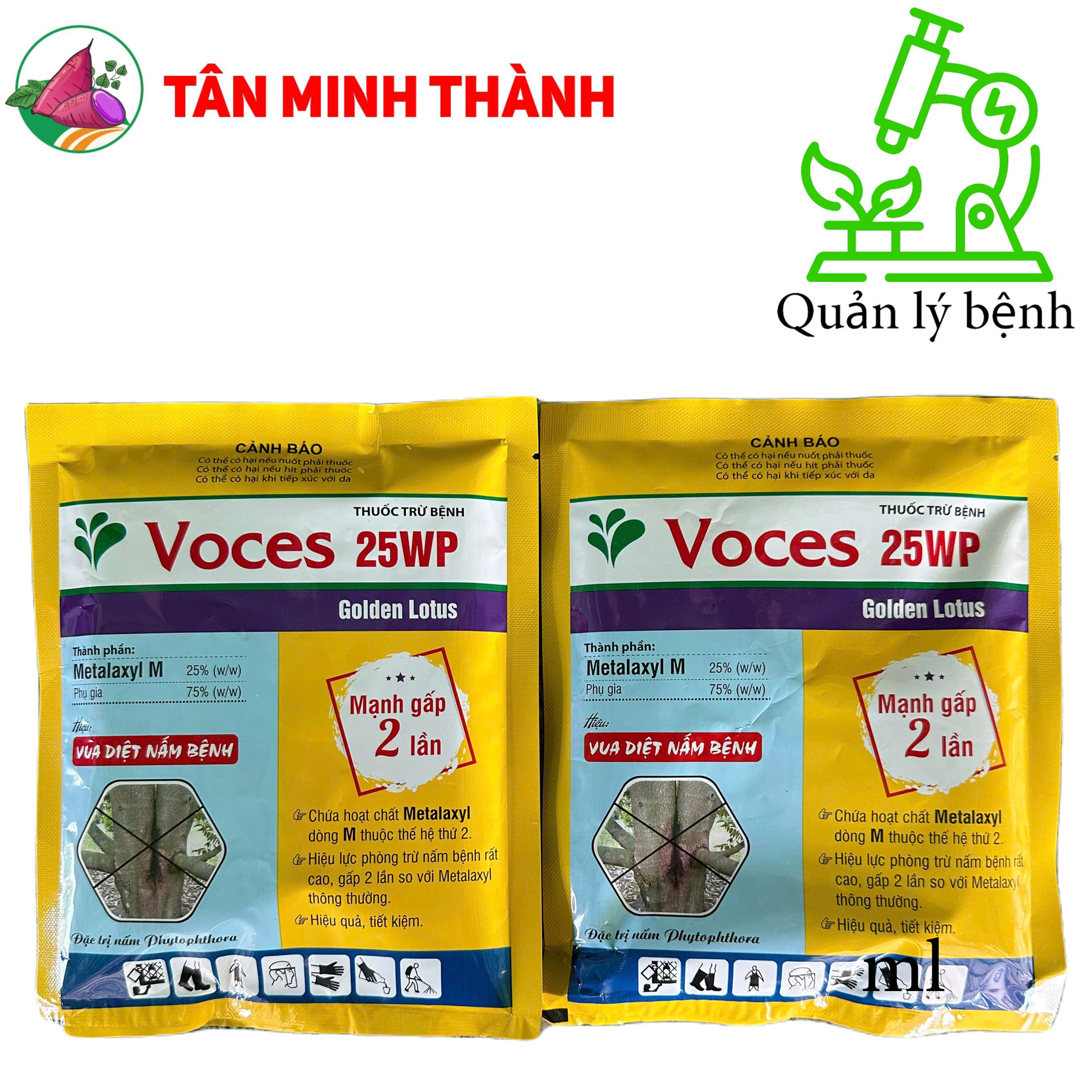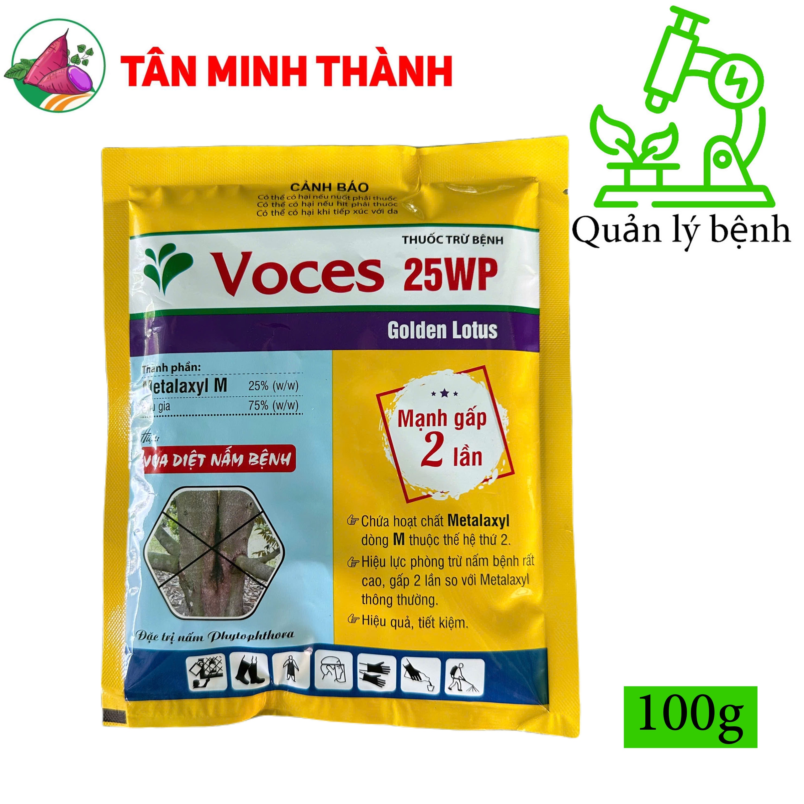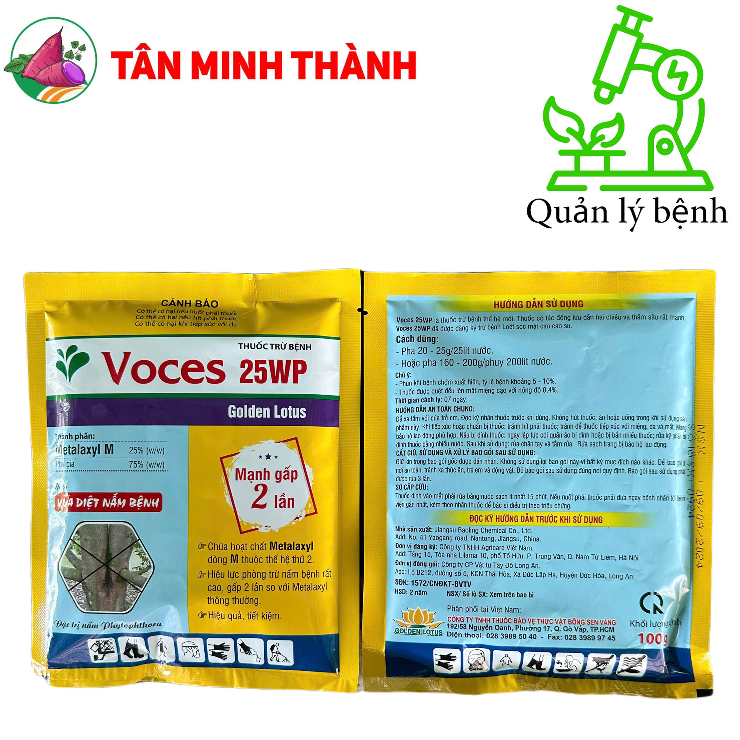 - Voces 25WP có chứa hoạt chất Metalaxyl dòng M, đây là dòng mạnh nhất hiện nay, hiệu lực phòng trừ bệnh rất cao, mạnh gấp 2 lần so với dòng Metalyxy thông thường. Thuốc có tác động lưu dẫn hai chiều, phố t Hùng rộng, dùng để phòng trừ nấm bệnh đã kháng thuốc.